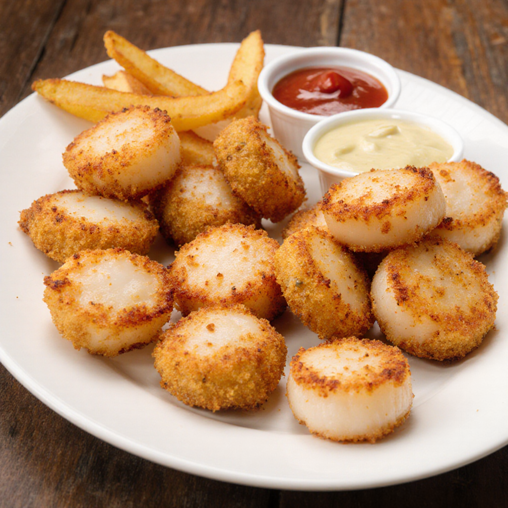 10 scallops breaded, fried and served with your choice of 2 Sides & cocktail sauce or tartar sauce.